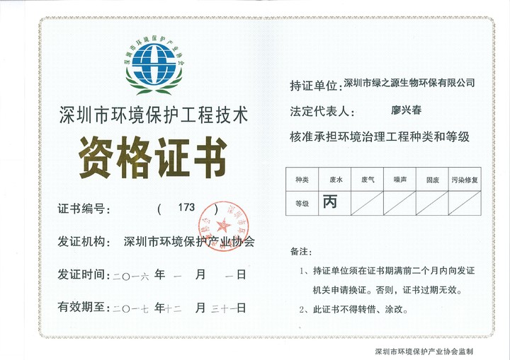 深圳市環境保護工程技術資格證書